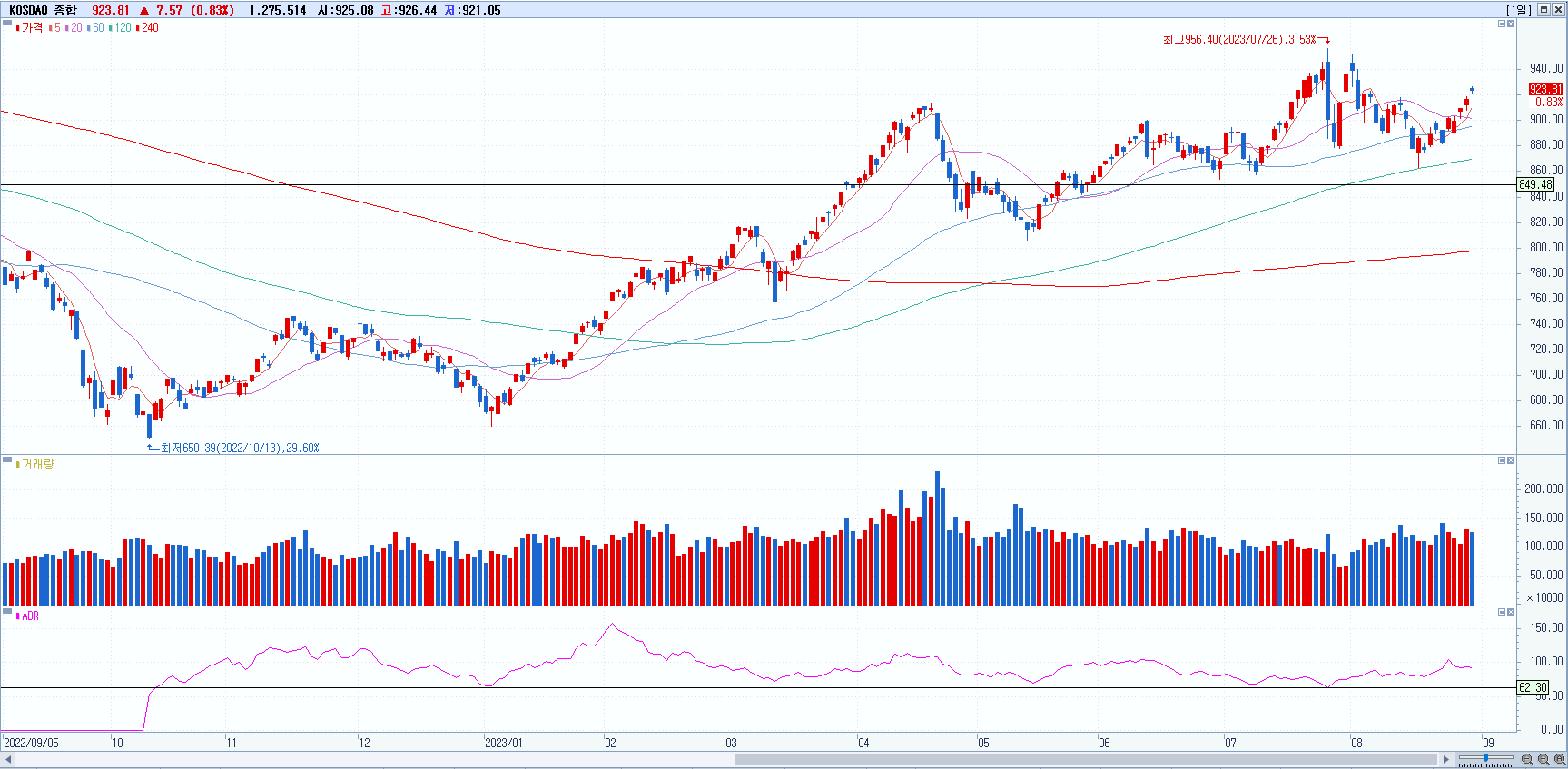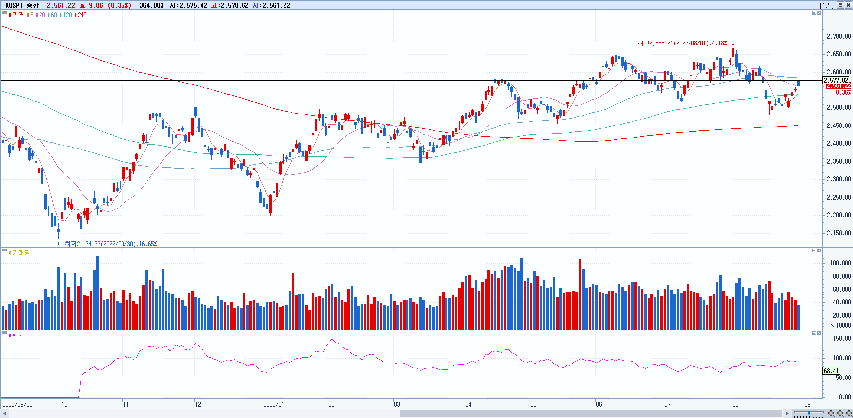 KOSPI 2561 +0.35% 상승, KOSDAQ 923 +0.83% 상승