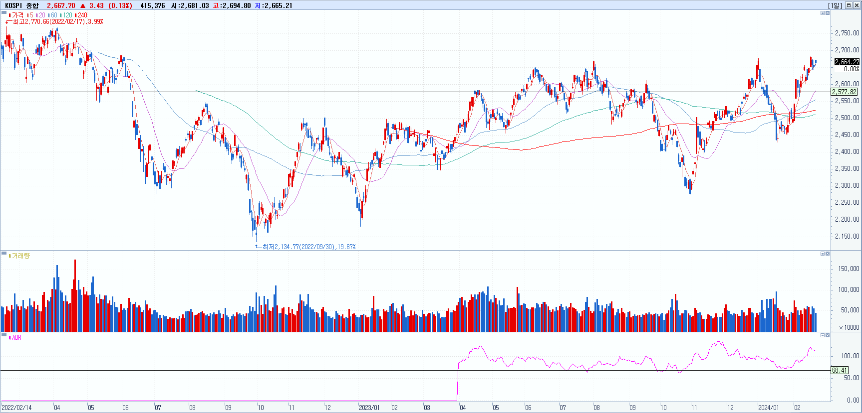 KOSPI 2667.7 +0.13% 상승, KOSDAQ 868.57 -0.18% 하락