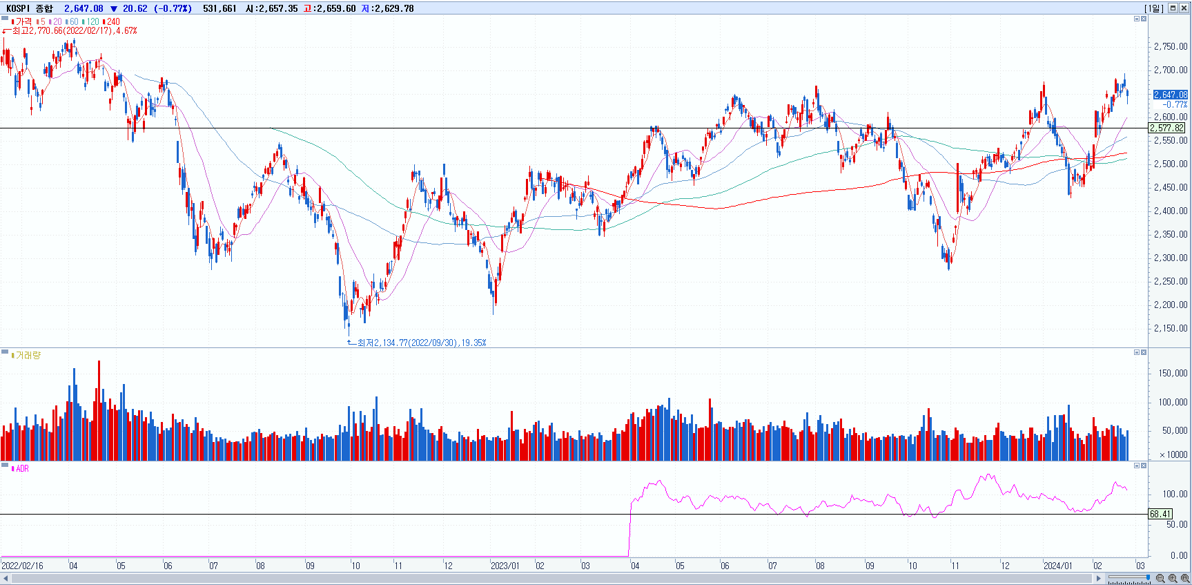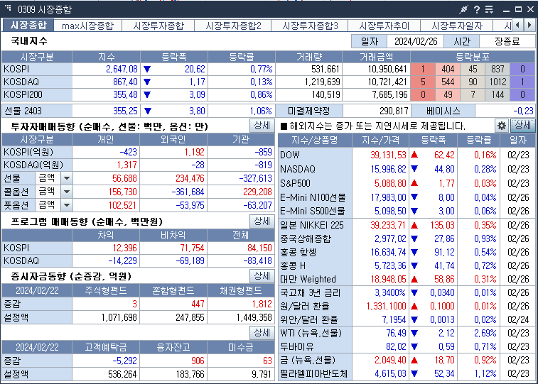KOSPI 2647.08 -0.77% 하락 KOSDAQ 867.40 -0.13% 하락