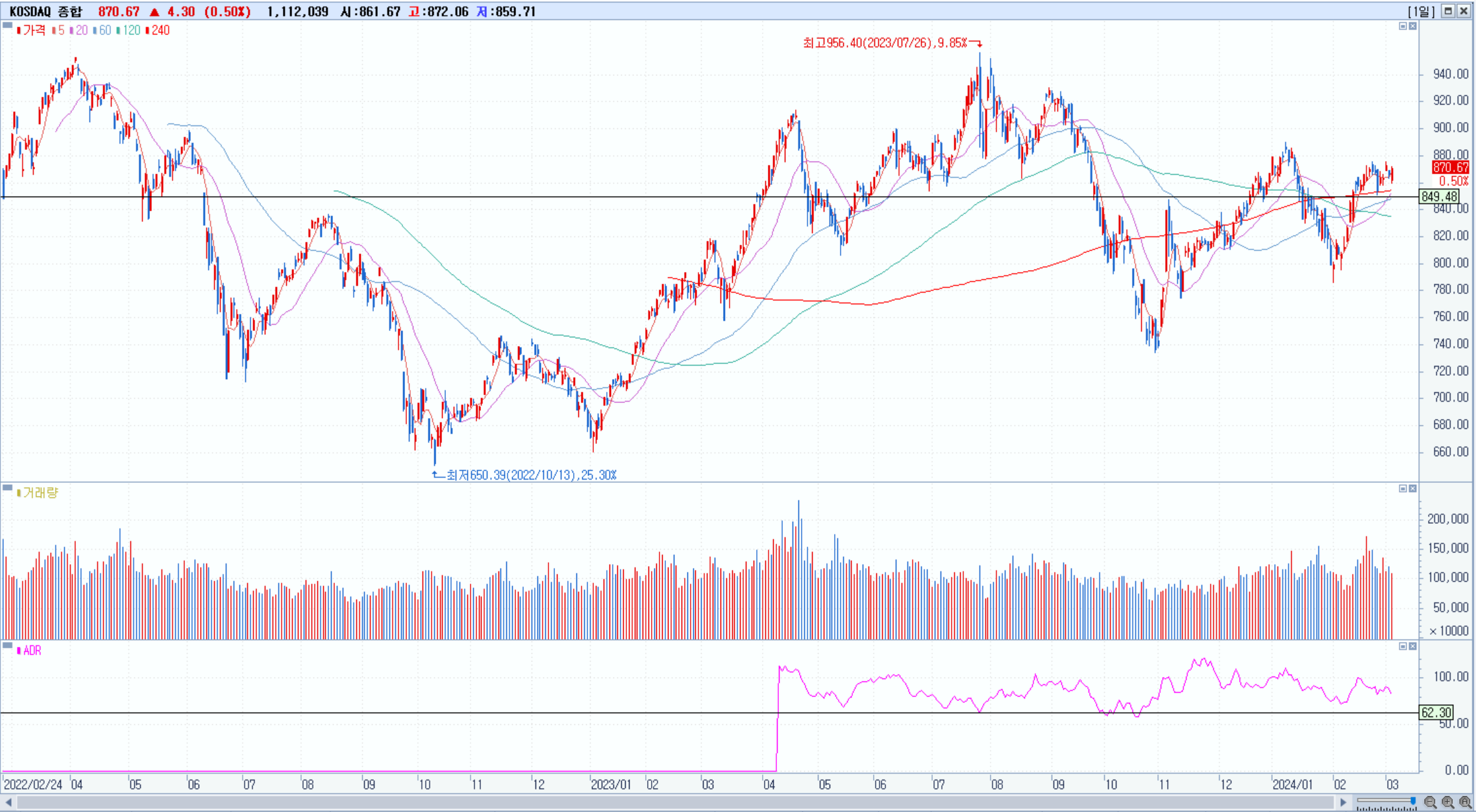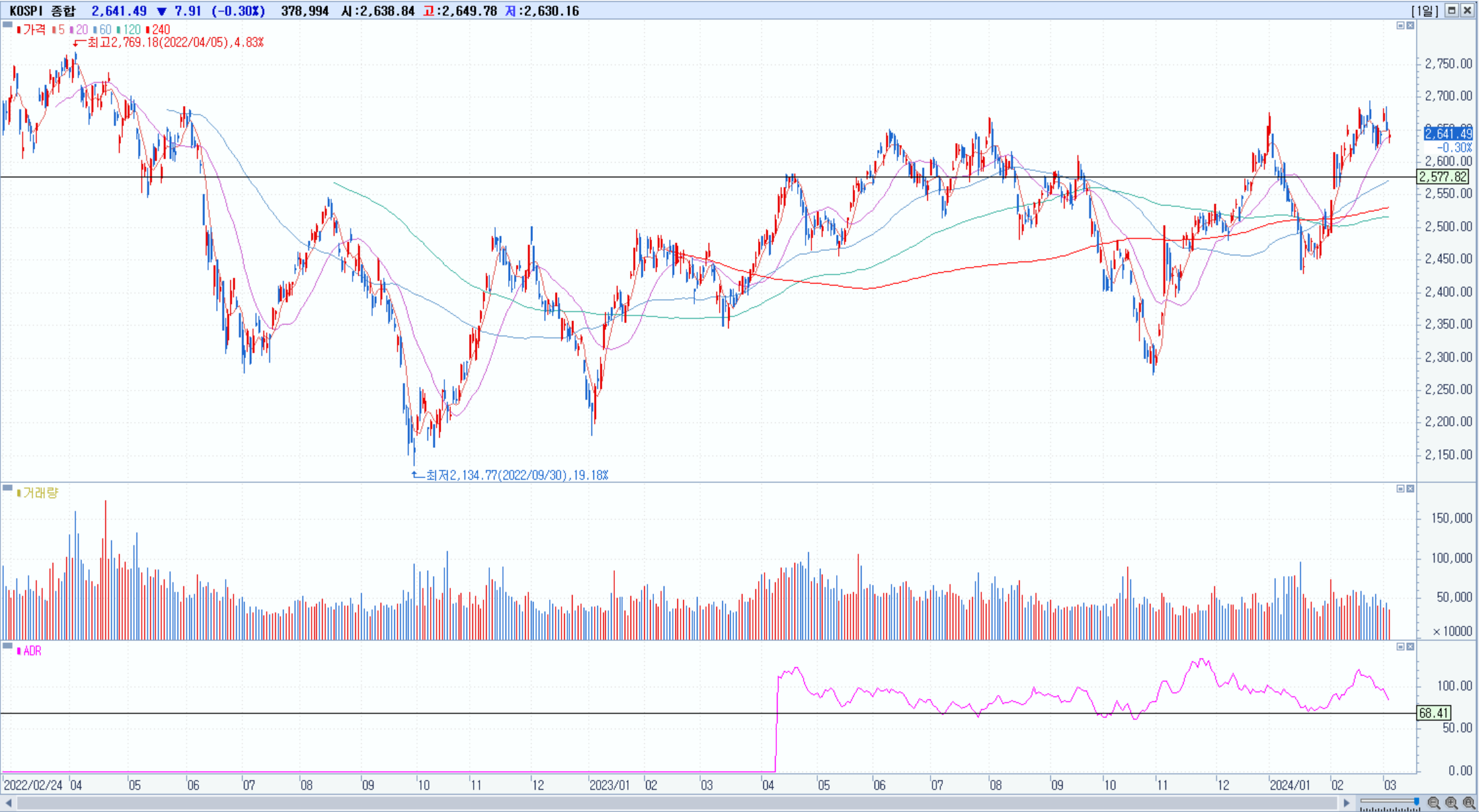 KOSPI 2641.49 -0.3% 하락, KOSDAQ 870.67 +0.5% 상승