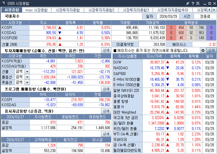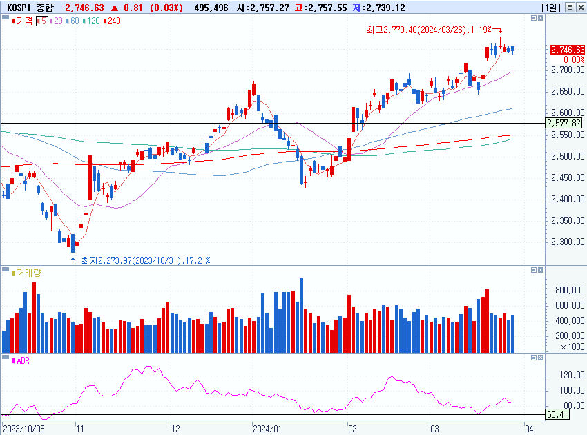 KOSPI 2746.63 0.03% 상승, KOSDAQ 905.5 -0.5% 하락