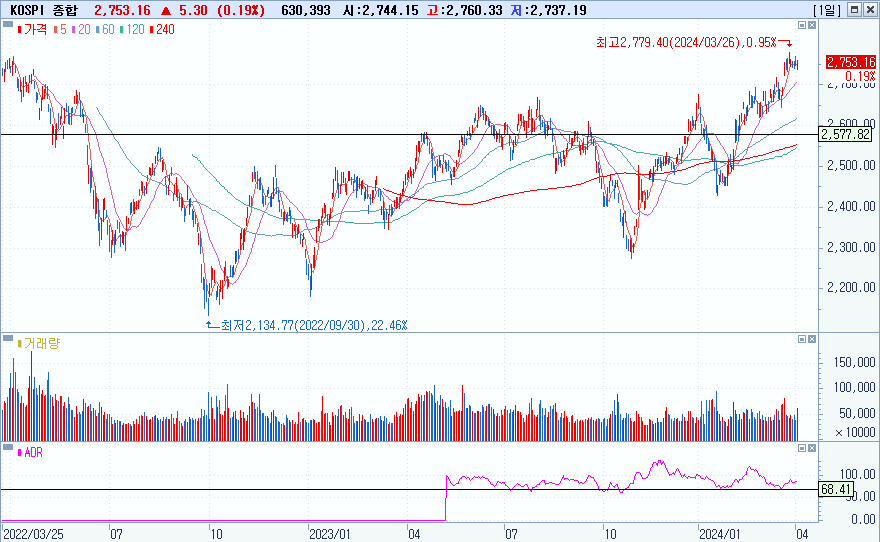 KOSPI 2753.16 +0.19% 상승, KOSDAQ 891.59 -2.29% 하락