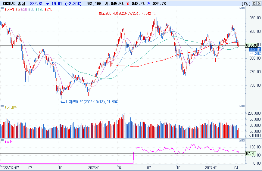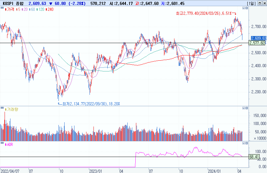 KOSPI 2609.63 -2.28% 하락, KOSDAQ 832.81 -2.3% 하락