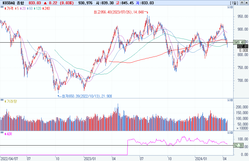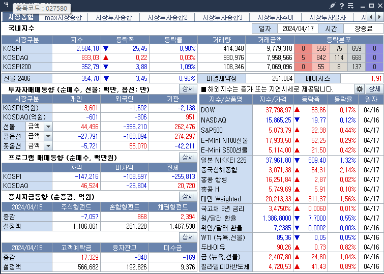 KOSPI 2584.18 -0.98% 하락, KOSDAQ 833.03 0.03% 상승