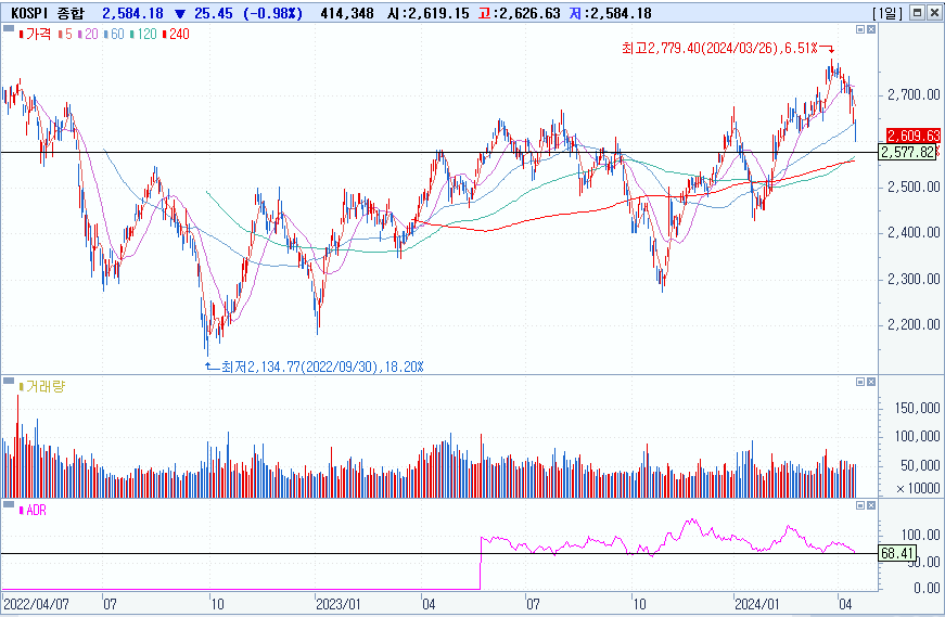 KOSPI 2584.18 -0.98% 하락, KOSDAQ 833.03 0.03% 상승