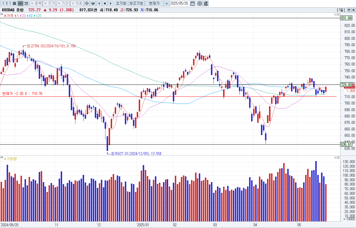 5/26 KOSDAQ 725.27(+1.30%) 관세 우려 완화(+), 외국인/기관 순매수(+)
