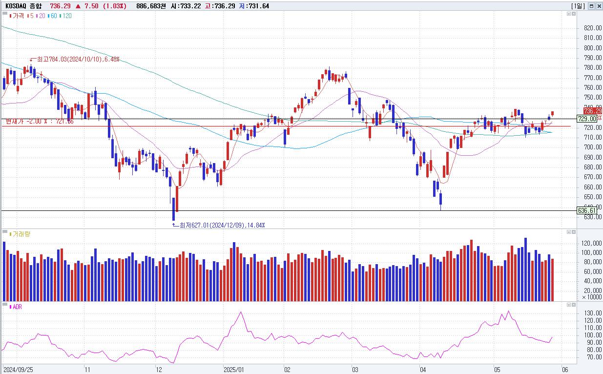 5/29 KOSDAQ 736.29(+1.03%) 대선 정책 기대감 지속(+), 한은 기준금리 인하(+), 美 관세 우려 완화·엔비디아 실적 호조(+), 기관 순매수(+)