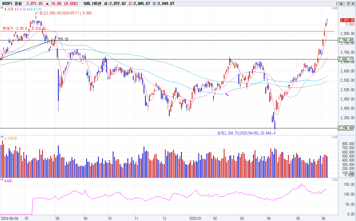 6/10 KOSPI 2,871.85(+0.56%) 새 정부 출범 기대감 지속(+), 외국인 순매수 지속(+), 차익실현 매물(-)