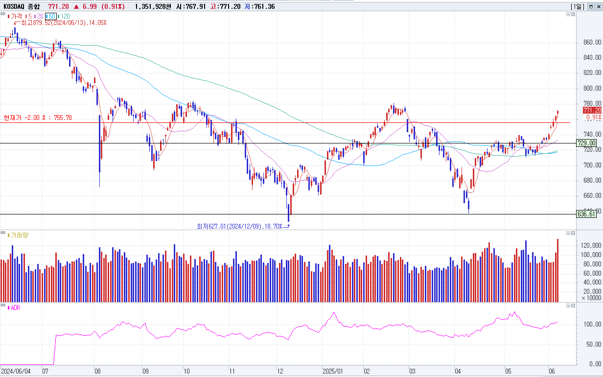 6/10 KOSDAQ 771.20(+0.91%) 새 정부 출범 기대감 지속(+), 외국인/개인 순매수(+), 제약/바이오株 강세(+)