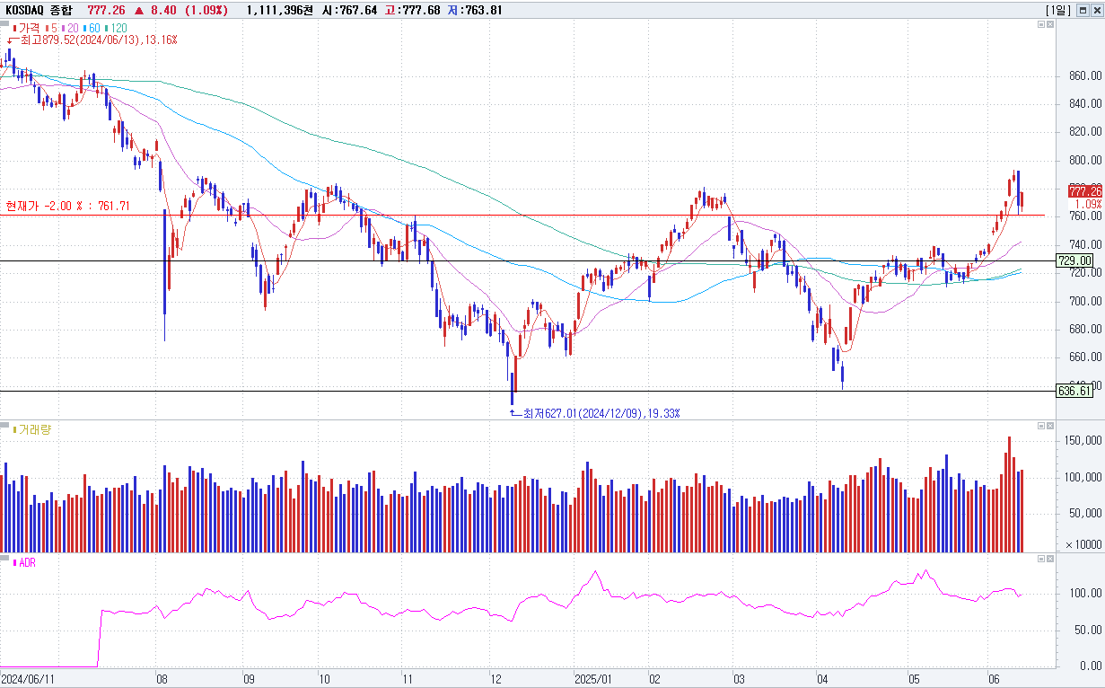 6/16 KOSDAQ 777.26(+1.09%) 새 정부 기대감 지속(+), 외국인/기관 순매수(+), 중동 지정학적 리스크 속 개인 순매도(-)