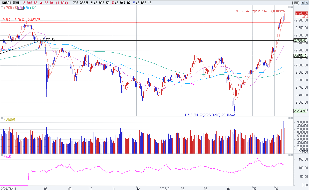 6/16 KOSPI 2,946.66(+1.80%) 새 정부 기대감 지속(+), 개인/기관 순매수(+), 중동 지정학적 리스크 속 외국인 순매도(-)