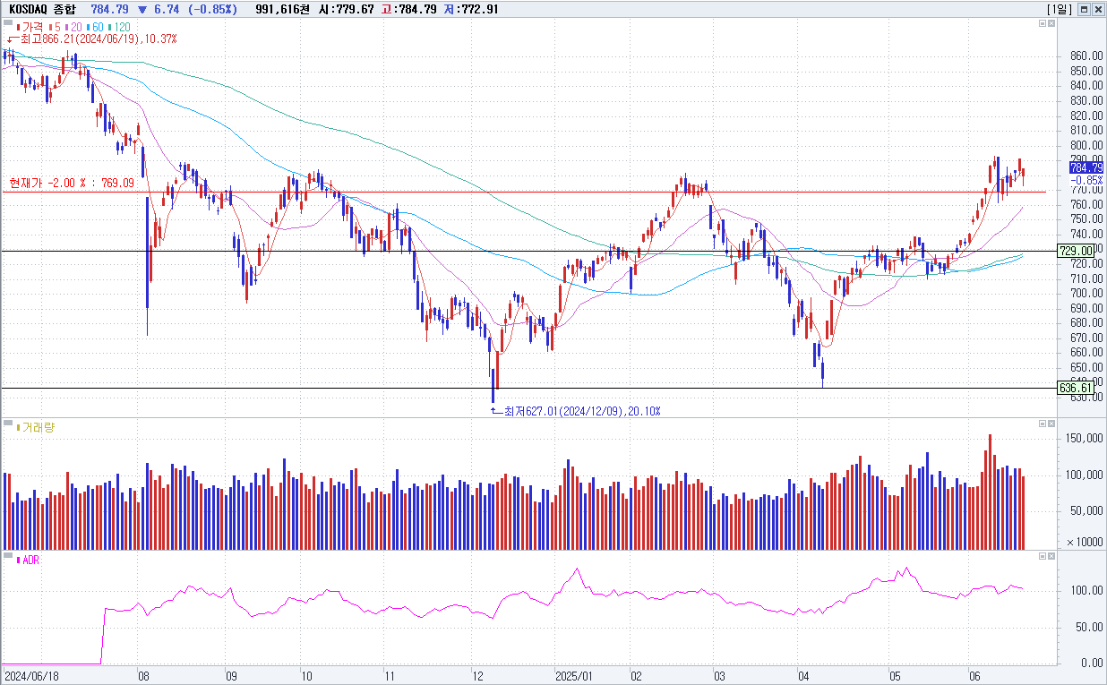 6/23 KOSDAQ 784.79(-0.85%) 중동 지정학적 리스크 고조(-), 외국인/기관 순매도(-), 개인 순매수(+)