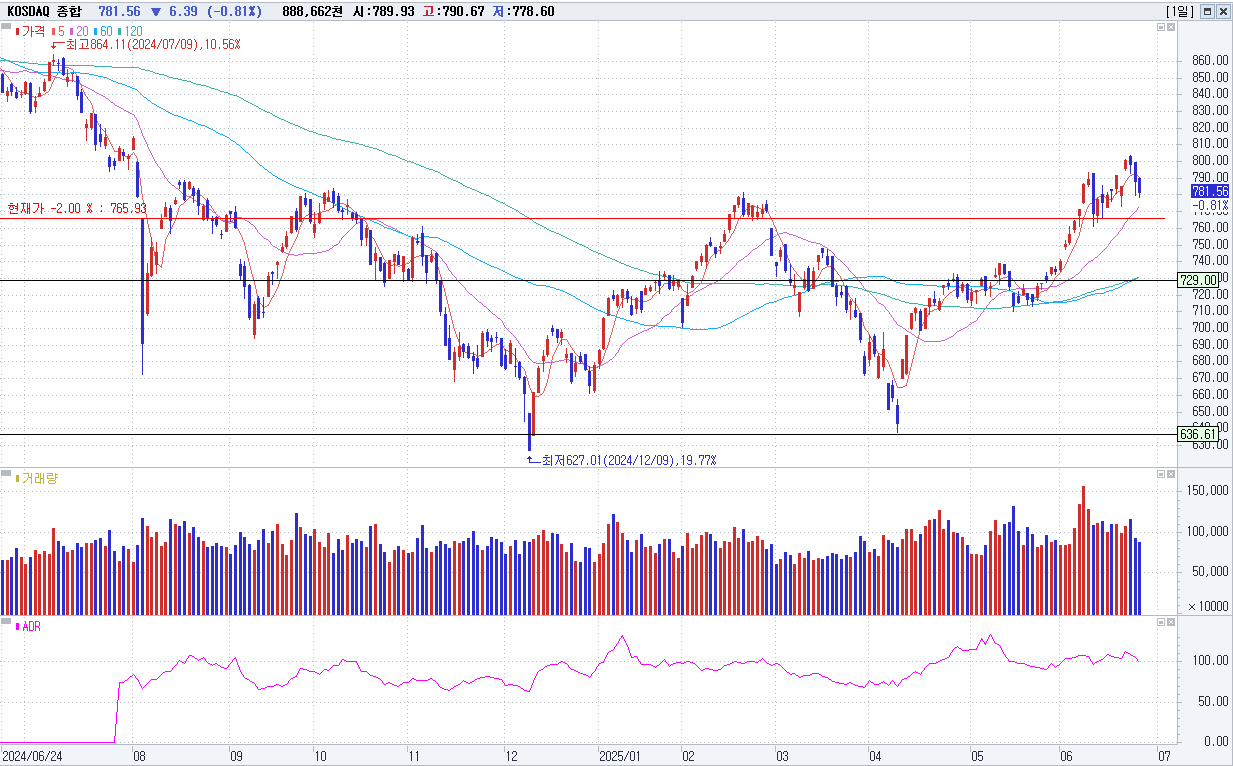 6/27 KOSDAQ 781.56(-0.81%) 외국인 순매도(-), 개인/기관 순매수(+)