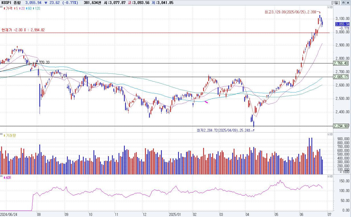 6/27 KOSPI 3,055.94(-0.77%) 단기 급등 부담 속 외국인 순매도(-), 개인/기관 순매수(+)