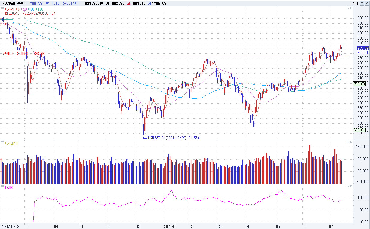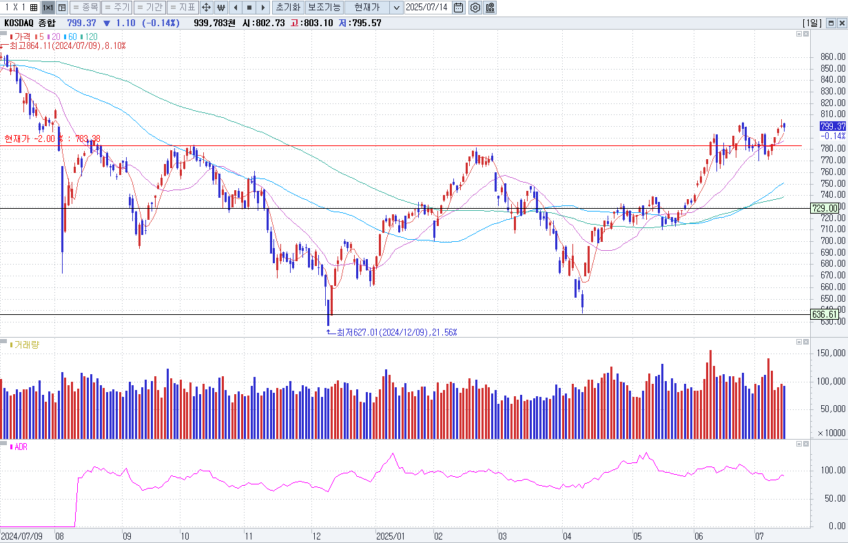 7/14 KOSDAQ 799.37(-0.14%) 외국인·기관 동반 순매도(-), 개인 순매수(+)
