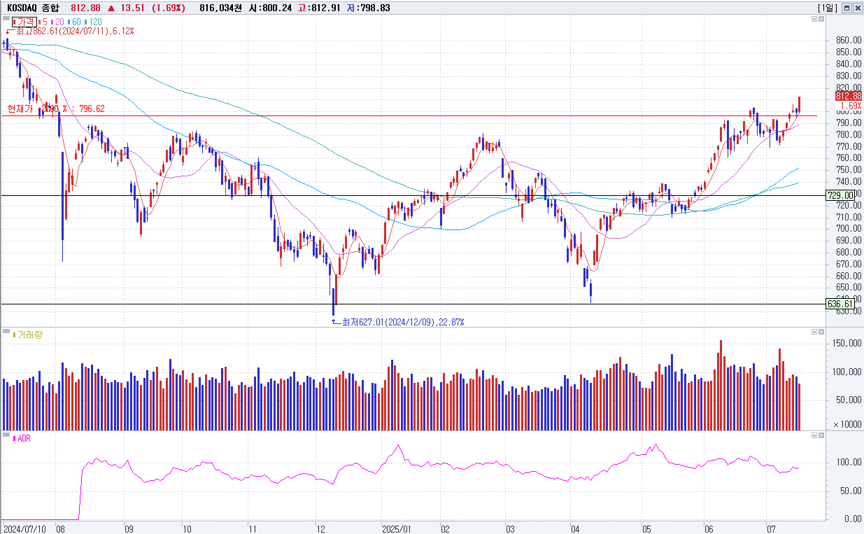 7/15 KOSDAQ 812.88(+1.69%) 외국인 순매수(+), 비만치료제株 상승(+)