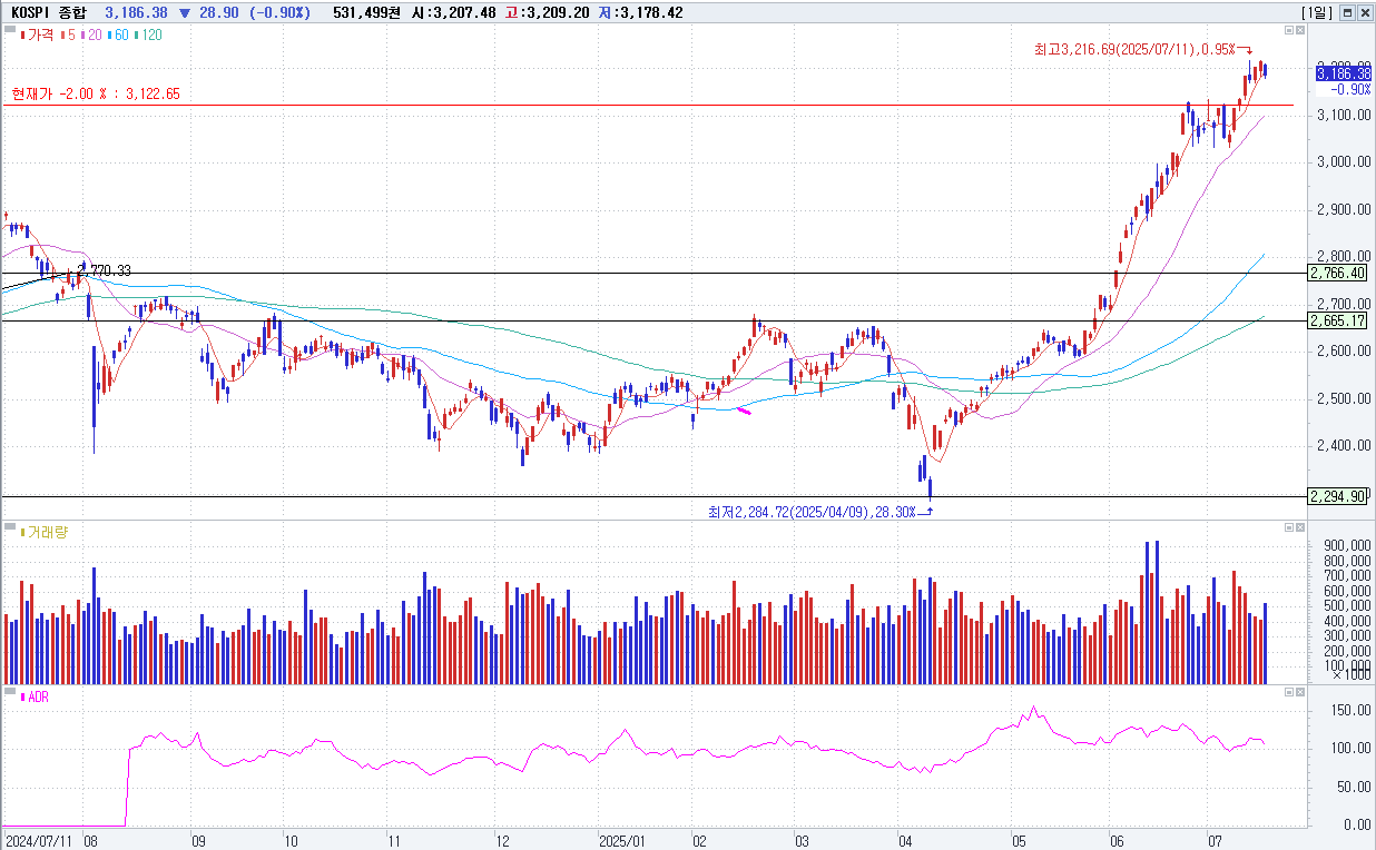지난밤 뉴욕증시가 CPI 반등 속 인플레 우려, 엔비디아 강세 속 혼조, 유럽 주요국 증시는 美-EU 무역협상 불확실성 등에 하락. 이날 코스피지수는 3,207.48(-7.80P, -0.24%)로 하락 출발. 장 초반 3,209.20(-6.08P, -0.19%)에서 장중 고점을 형성한 후 낙폭을 키워 3,178.42(-36.86P, -1.15%)에서 장중 저점을 기록. 오전 한때 3,200선까지 낙폭을 줄이기도 했으나 오후 들어 시간이 갈수록 재차 낙폭을 확대했고, 장 후반 3,178선까지 하락한 후 결국 3,186.38(-28.90P, -0.90%)에서 거래를 마감.