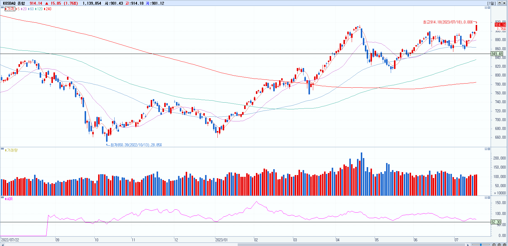 KOSDAQ은 1.76프로 상승하였으나 ADR지수는 -2.31% 하락으로 KOSDAQ 70% 종목이 하락으로 수급 솔림이 극심