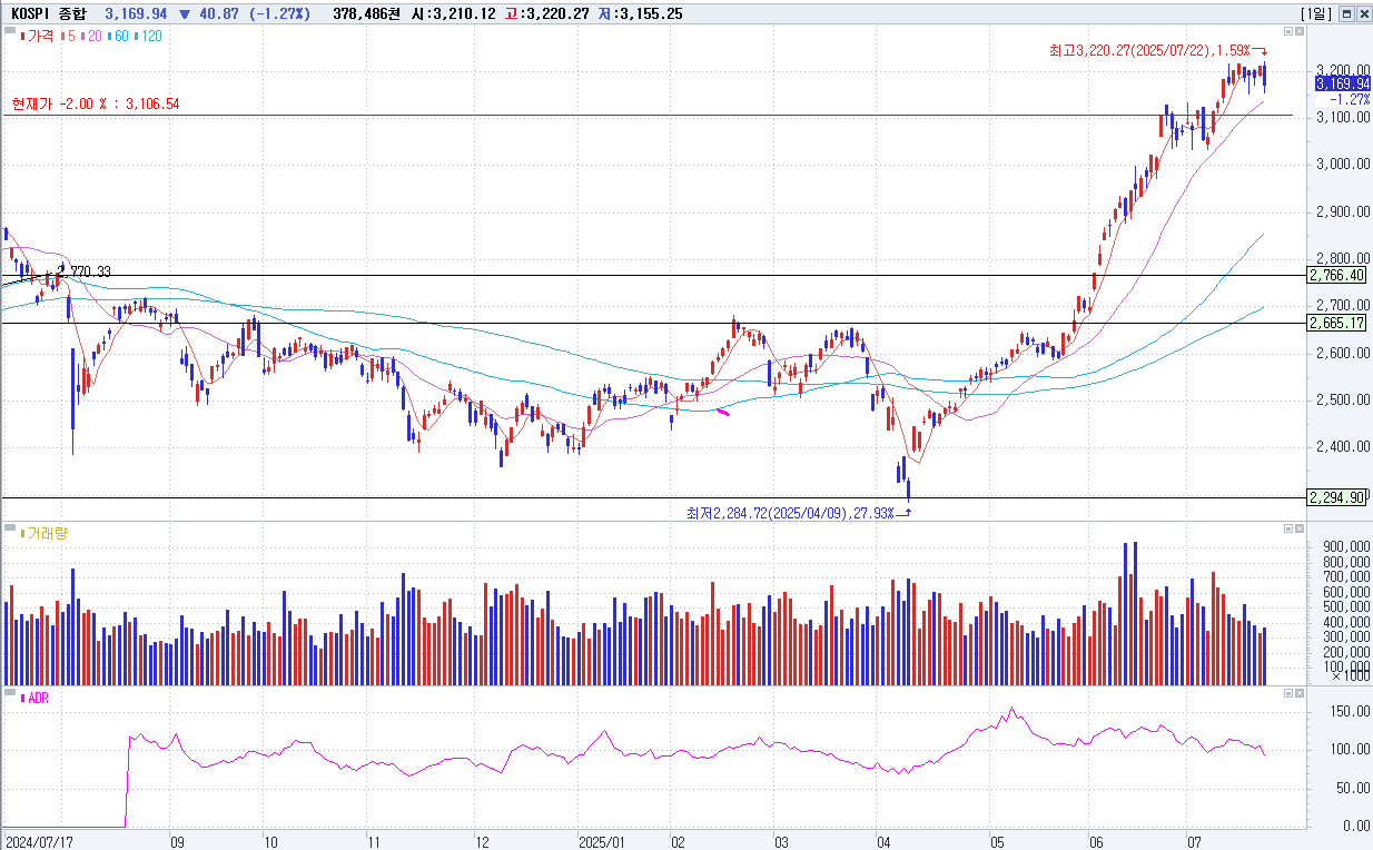 7/22 KOSPI 3,169.94(-1.27%) 차익실현 매물(-), 외국인/기관 순매도(-)