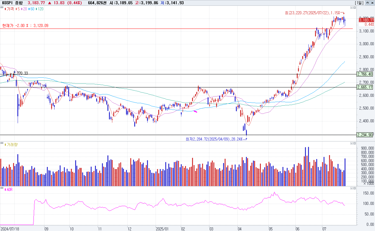 7/23 KOSPI 3,183.77(+0.44%) 美/日 무역협상 타결 속 韓/美 무역 협상 기대감 부각(+), 외국인/기관 순매수(+)