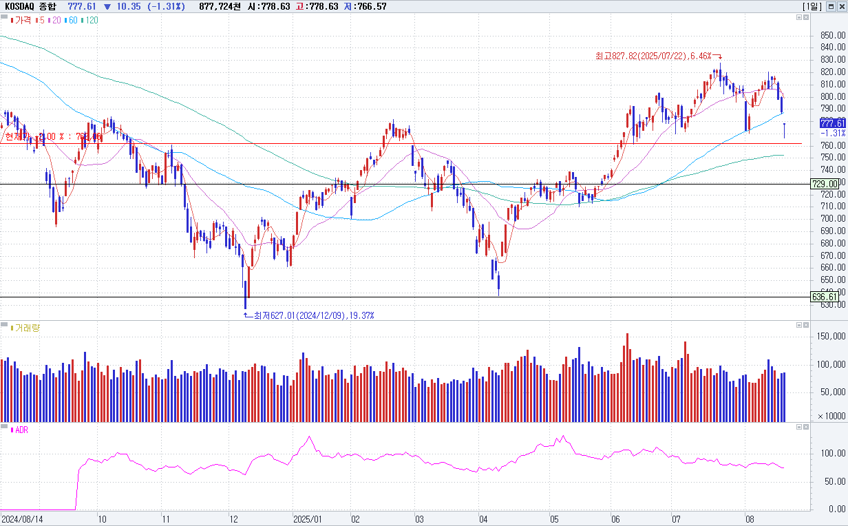 8/20 KOSDAQ 777.61(-1.31%) 증시 부양책 불확실성(-), 잭슨홀 경계감(-), AI 거품론 부각(-), 외국인/기관 순매도(-)