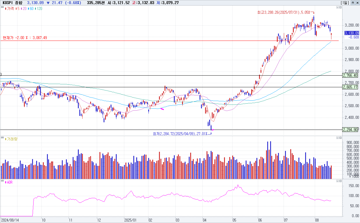 8/20 KOSPI 3,130.09(-0.68%) 증시 부양책 불확실성(-), 잭슨홀 경계감(-), AI 거품론 부각(-), 외국인/개인 순매도(-)