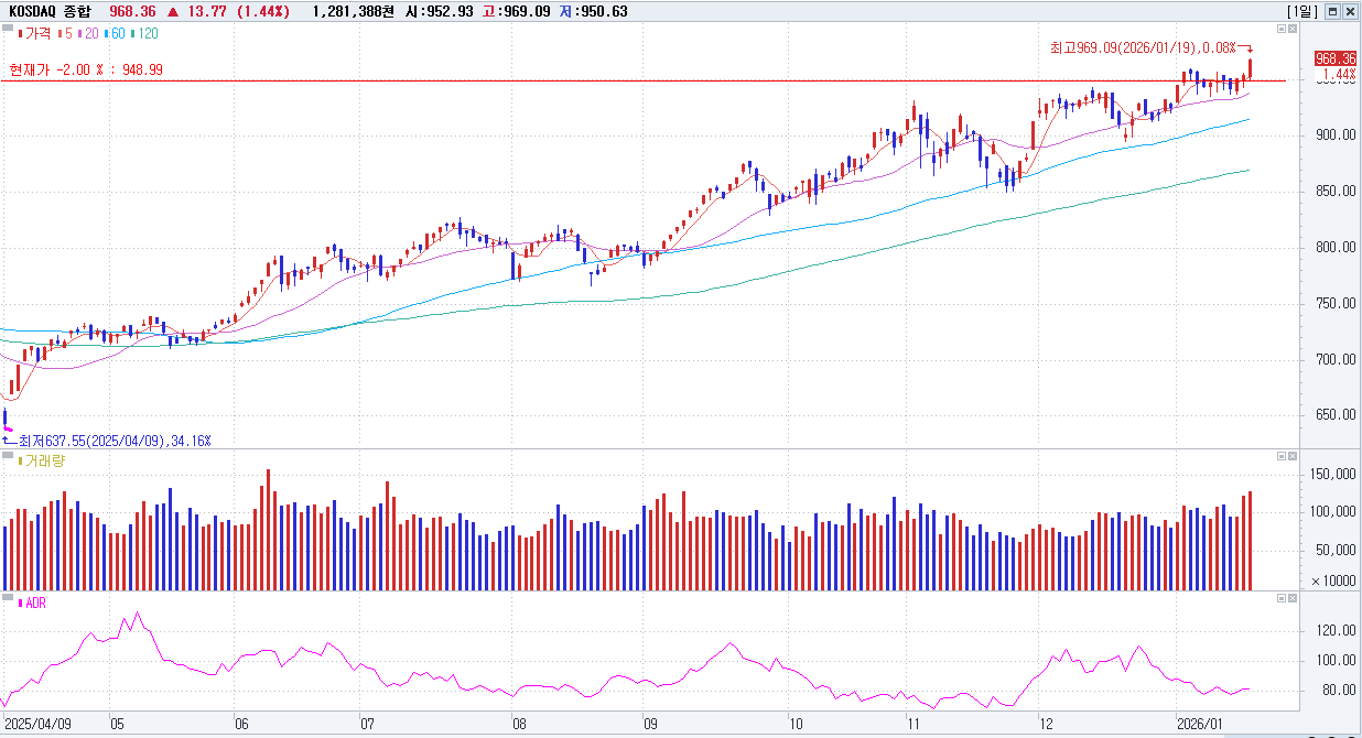 지난 주말 뉴욕증시가 Fed 의장 인선 불확실성, 그린란드 무역 보복 우려 등에 소폭 하락한 가운데, 이날 코스닥지수는 952.93(-1.66P, -0.17%)로 약보합 출발. 장 초반 950.63(-3.96P, -0.41%)에서 장중 저점을 기록한 후 상승 전환했고, 오전중 960선 부근에서 움직이다 오후 들어 상승폭을 더욱 확대. 장 후반 969.09(+14.50P, +1.52%)에서 장중 고점을 형성한 후 결국 968.36(+13.77P, +1.44%)에서 거래를 마감.