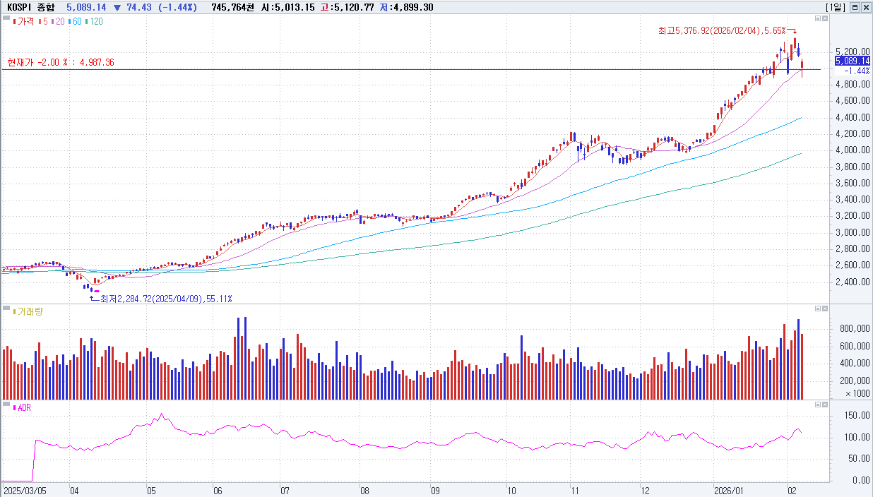 지난밤 뉴욕증시가 AI 투자 부담 및 SW 산업 타격 우려 지속, 고용지표 부진 등에 하락, 유럽 주요국 증시도 하락 마감. 이날 코스피지수는 5,013.15(-150.42P, -2.91%)로 급락 출발. 장 초반 4,899.30(-264.27P, -5.12%)에서 장중 저점을 기록한 후 시간이 갈수록 낙폭을 축소, 오전 한때 5,120.77(-42.80P, -0.83%)에서 장중 고점을 형성. 오후 들어 재차 낙폭을 확대해 오후 한때 4,994선까지 하락하기도 했으나 장 막판 낙폭을 다시 만회했고, 결국 5,089.14(-74.43P, -1.44%)에서 거래를 마감.
