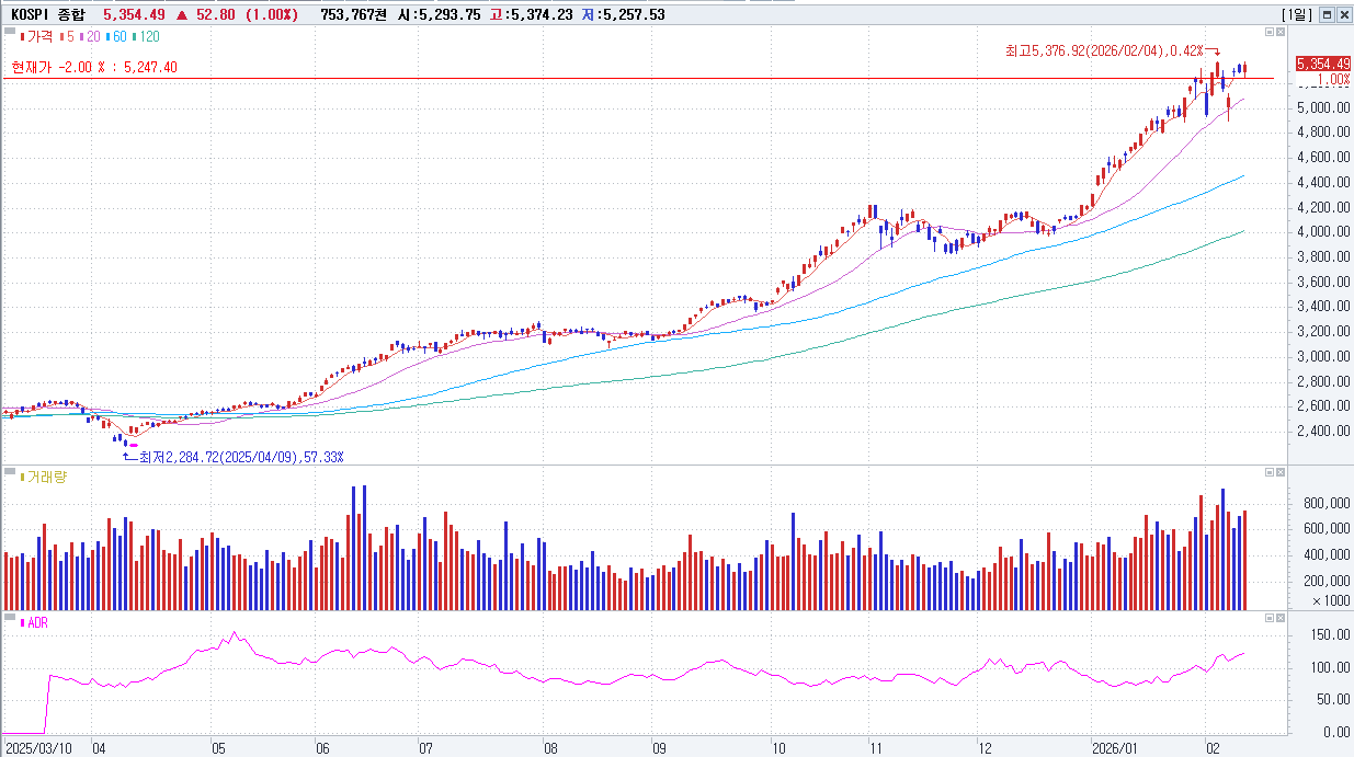 마감 지수 : KOSPI 5,354.49P(+52.80P/+1.00%)