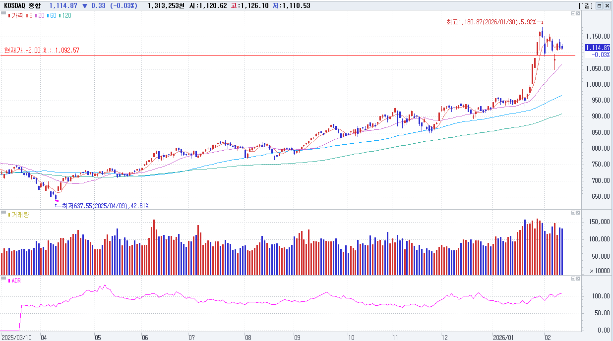 2/11 KOSDAQ 1,114.87(-0.03%) 개인 순매도(-), 기관·외국인 순매수(+)