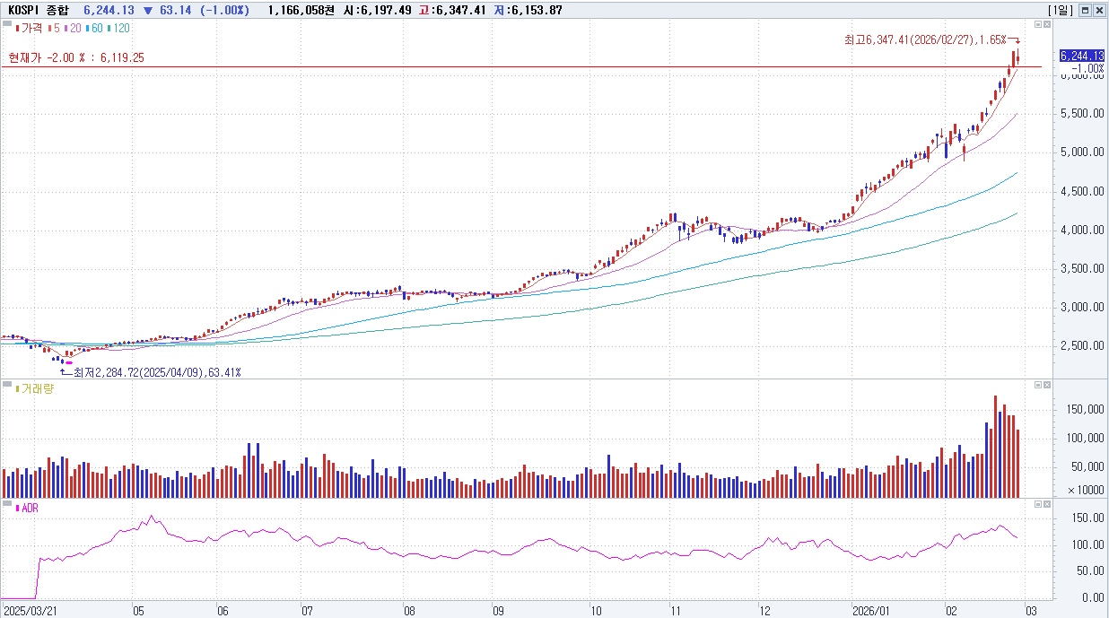 2/27 KOSPI 6,244.13(-1.00%) 외국인 대규모 순매도(-), 반도체株 하락(-), 개인·기관 순매수(+)