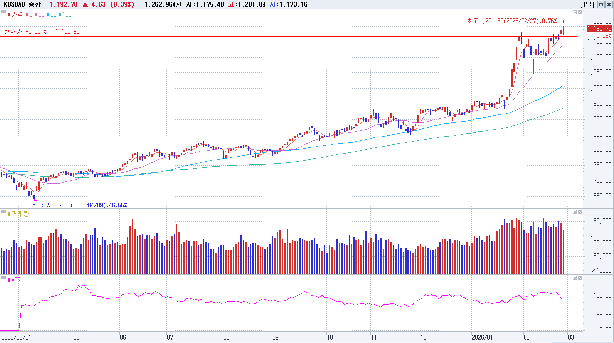 마감 지수 : KOSDAQ 1,192.78P(+4.63P/+0.39%)