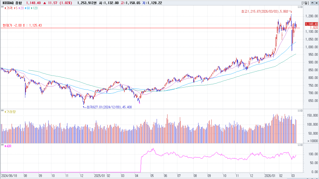 지난밤 뉴욕증시가 호르무즈 해협 긴장 주시 속 국제유가 급등 및 오라클 주가 급등 등에 혼조 마감한 가운데, 이날 코스닥지수는 1,132.00(-4.83P, -0.42%)으로 하락 출발. 장 초반 상승 전환했고, 1,150.65(+13.82P, +1.22%)에서 장중 고점을 형성. 이후 상승폭을 반납해 오전중 하락 전환했고, 오후 들어 1,128.22(-8.61P, -0.76%)에서 장중 저점을 기록. 이후 낙폭을 줄여 보합권을 중심으로 등락을 보이다 장 후반 상승폭을 재차 확대했고, 결국 1,148.40(+11.57P, +1.02%)에서 거래를 마감.