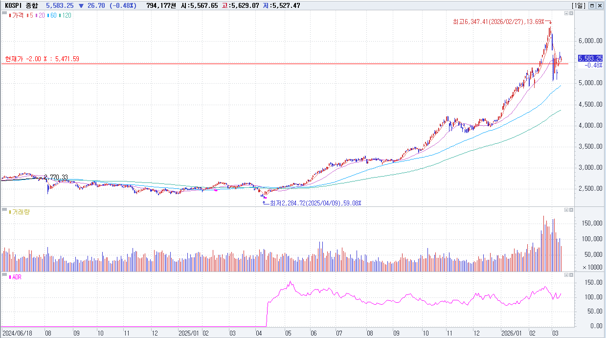 마감 지수 : KOSPI 5,583.25P(-26.70P/-0.48%)