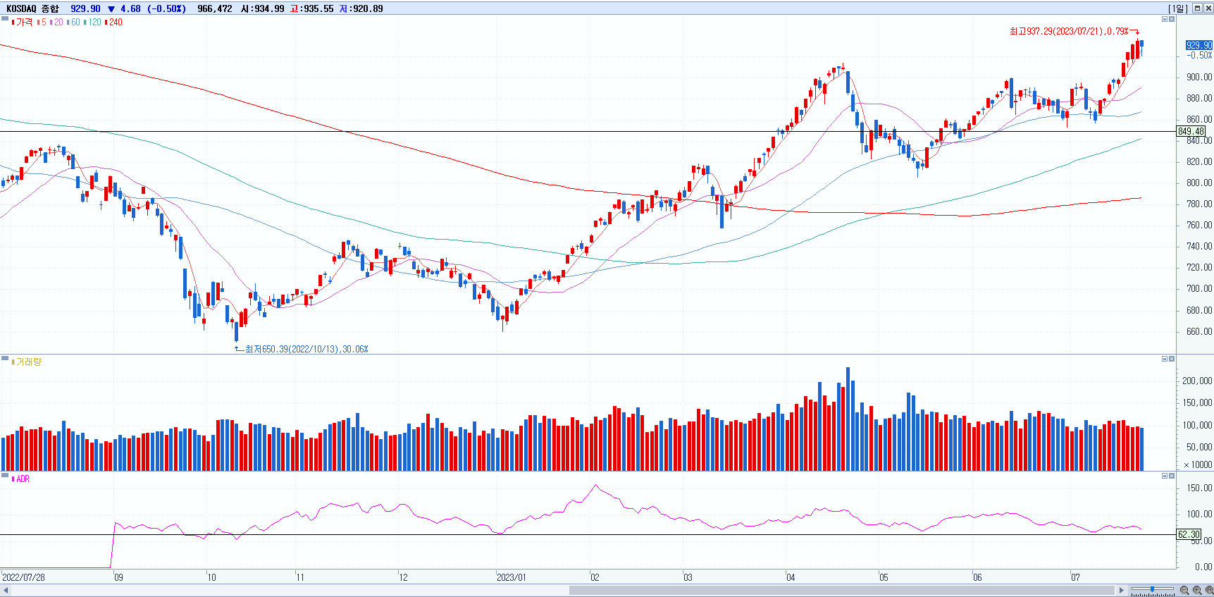 ADR 지표로 보면 KOSPI 상승 292 대 하락 973, KOSDAQ 상승 210 대 1337로 대부분의 종목은 하락을 하였으나 2차 전지 종목들만 상승세